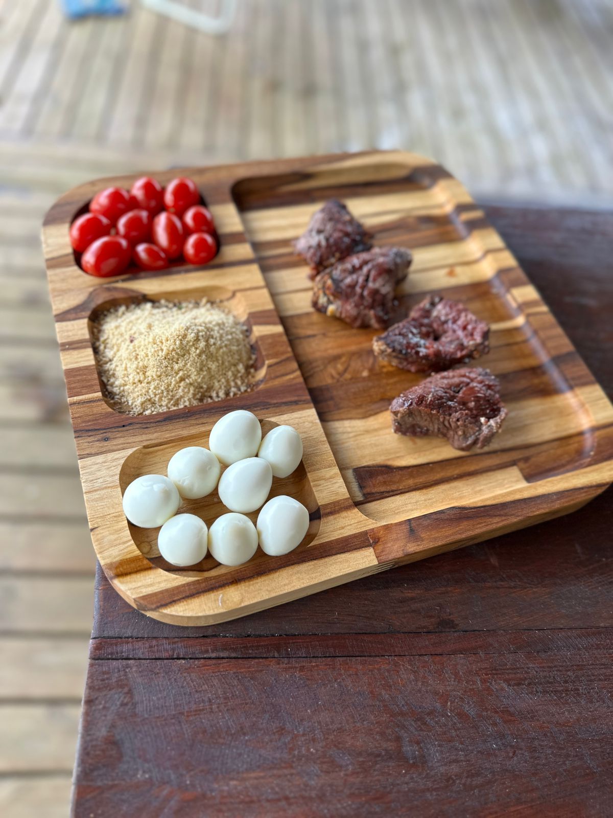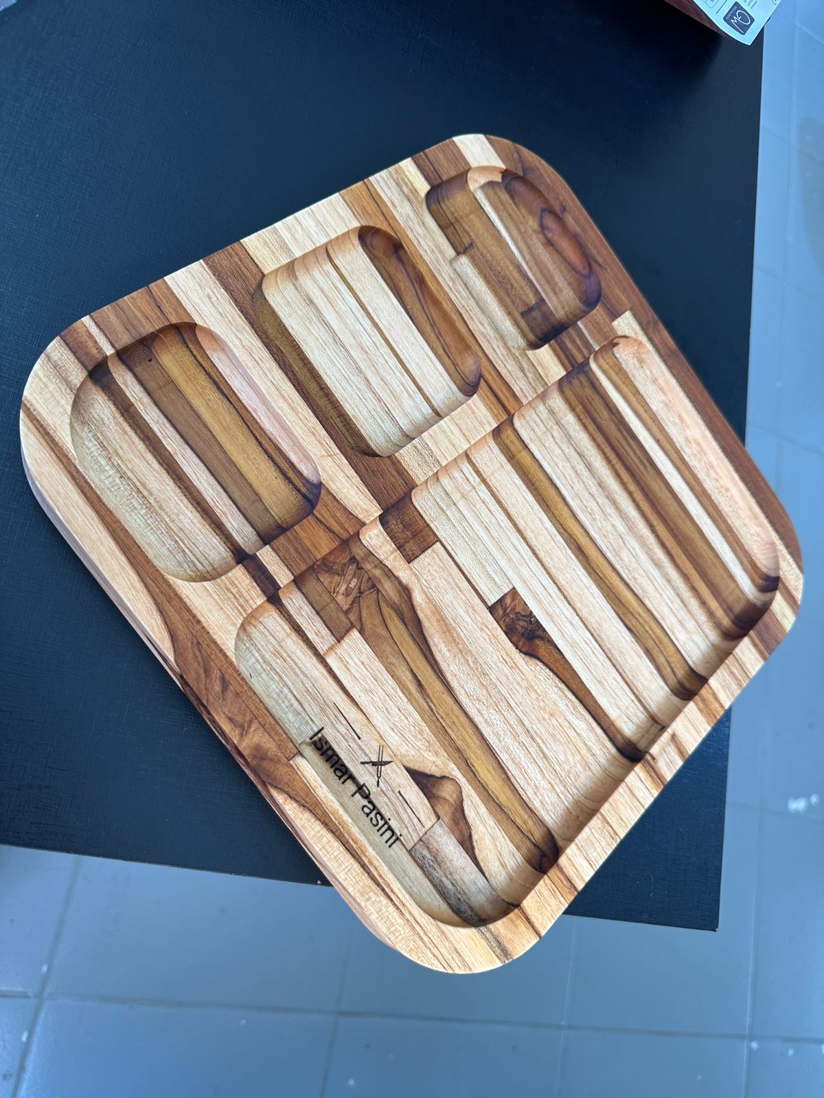 Nossa petisqueira 2 em 1 é produzida em madeira teca de alta qualidade, conhecida por sua resistência, durabilidade e tonalidade única. Com 29 cm e 4 espaços, ela é ideal para servir petiscos,  e também poder utilizar na parte maior como tábua de corte.