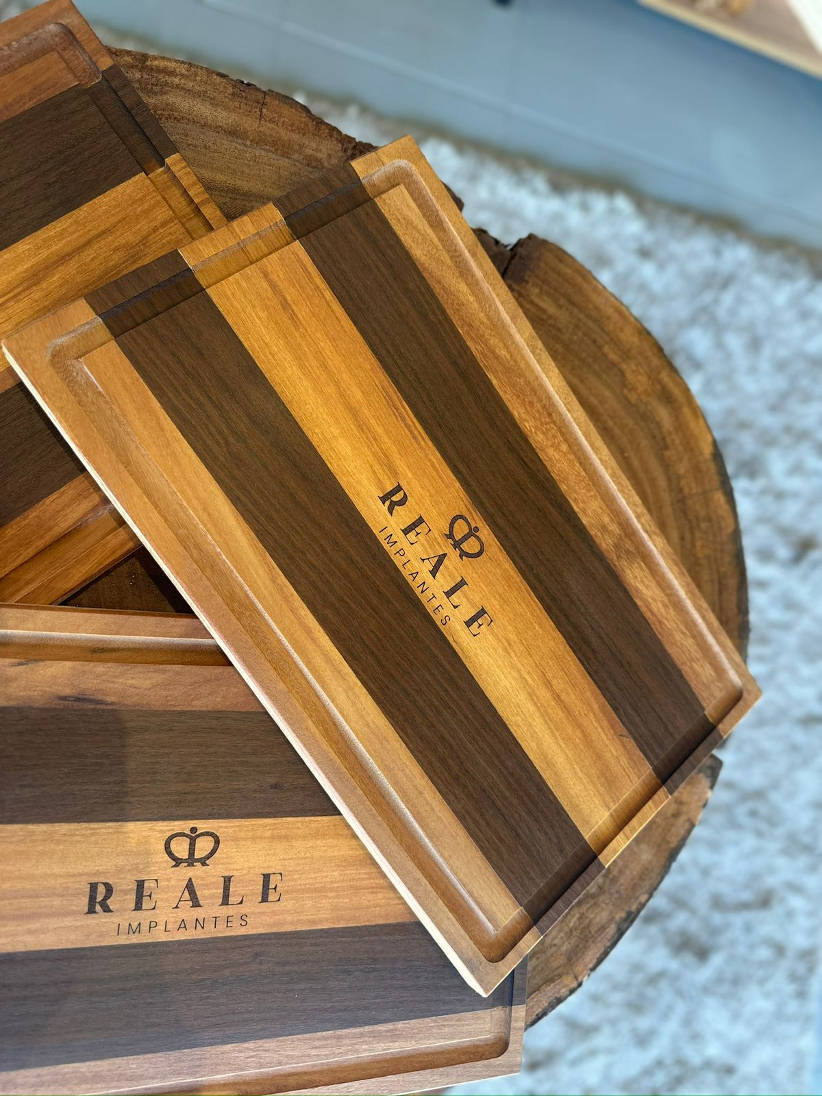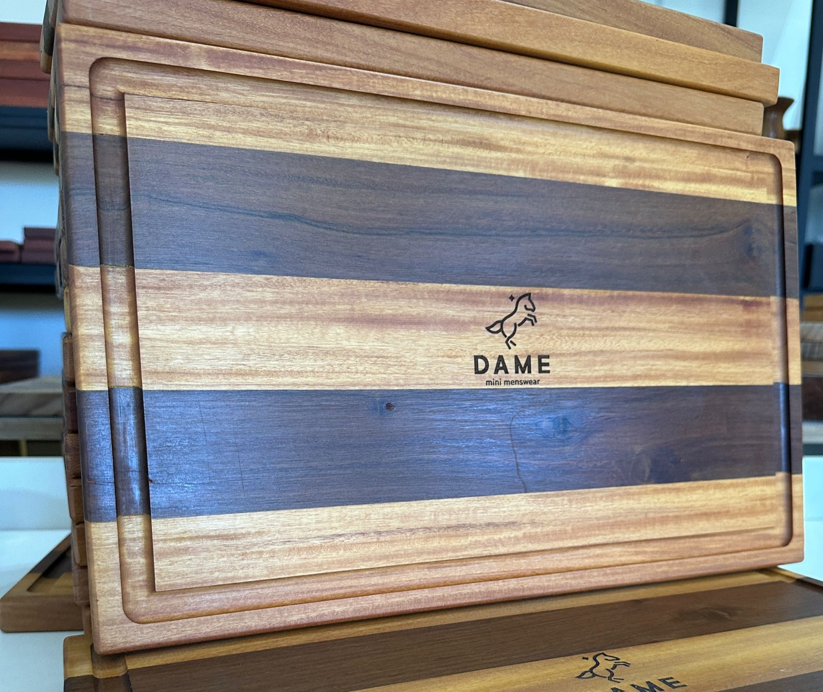 Tábua de churrasco em madeira mesclada de garapeira e ipê com rebaixe para recolher líquidos.