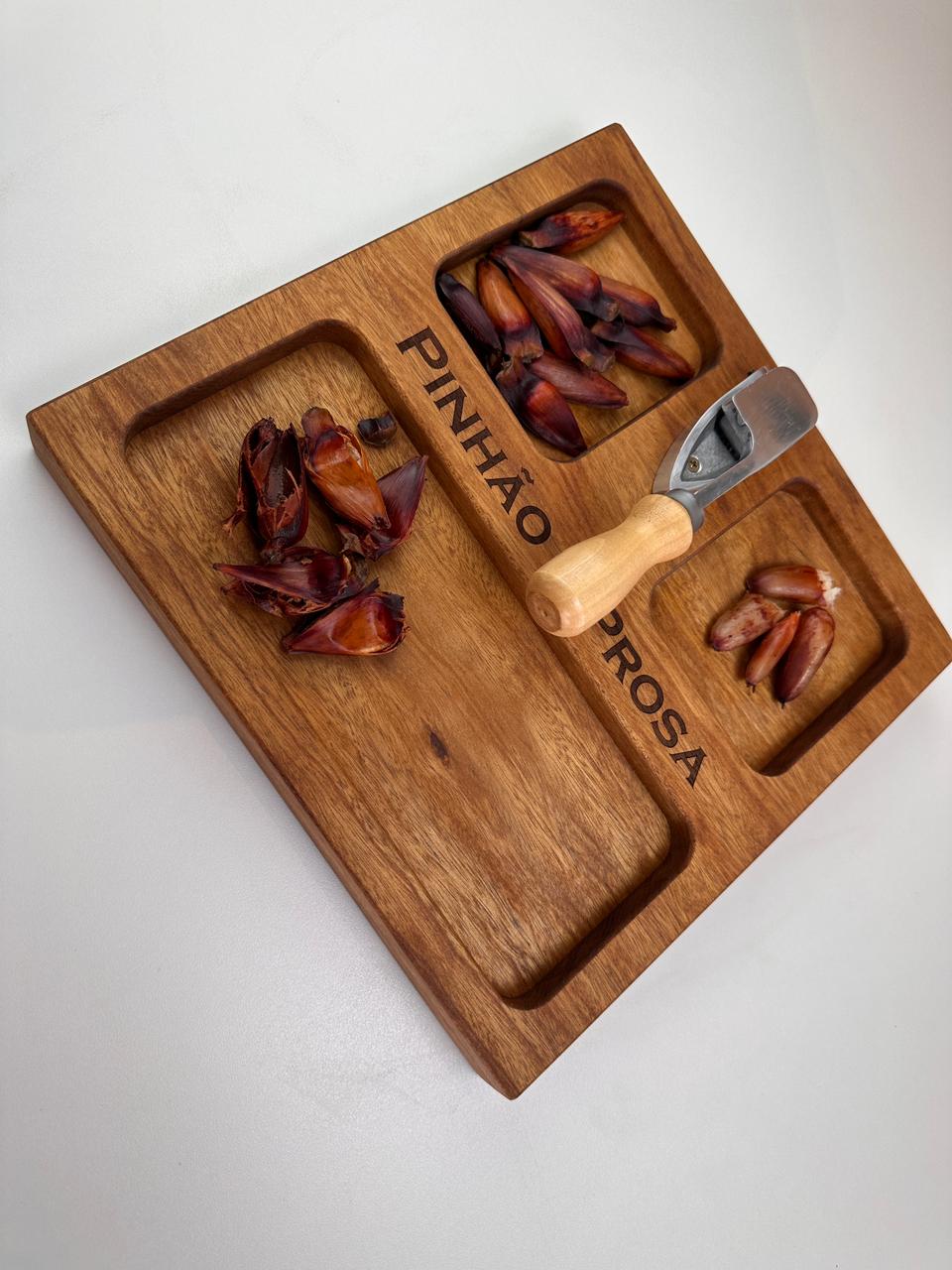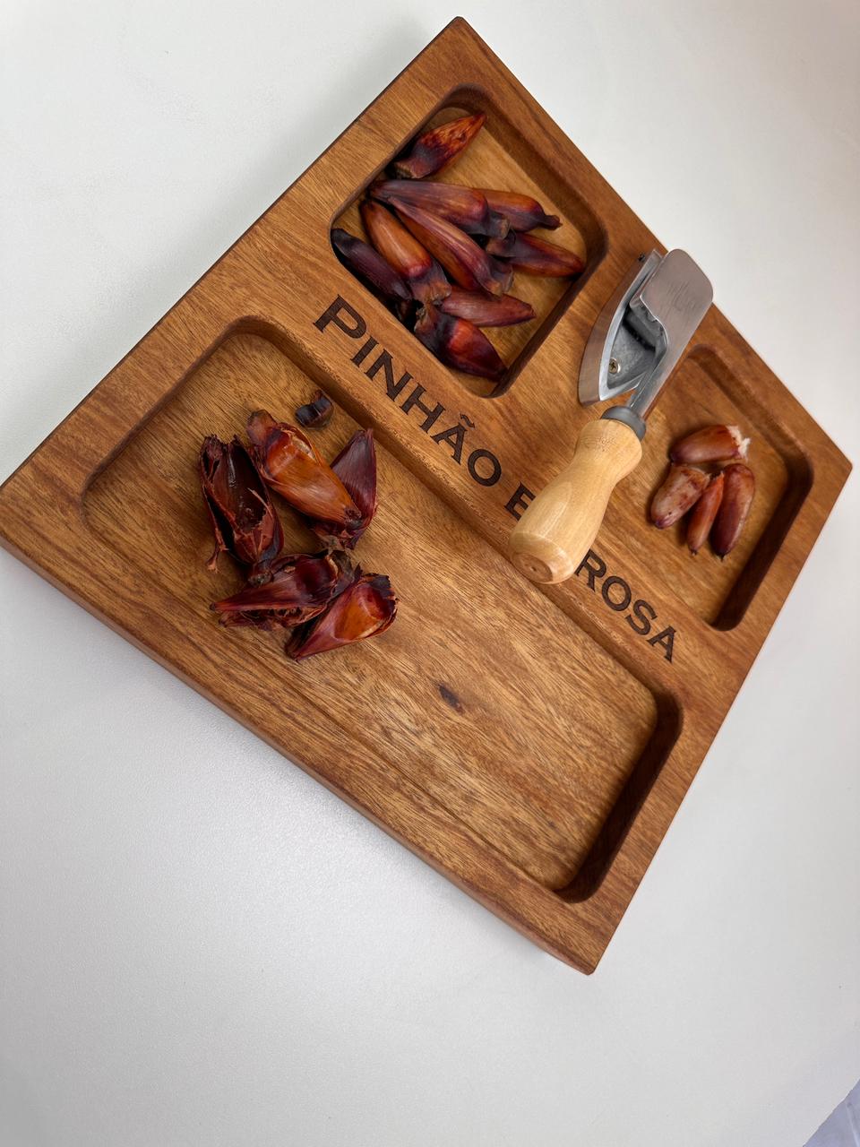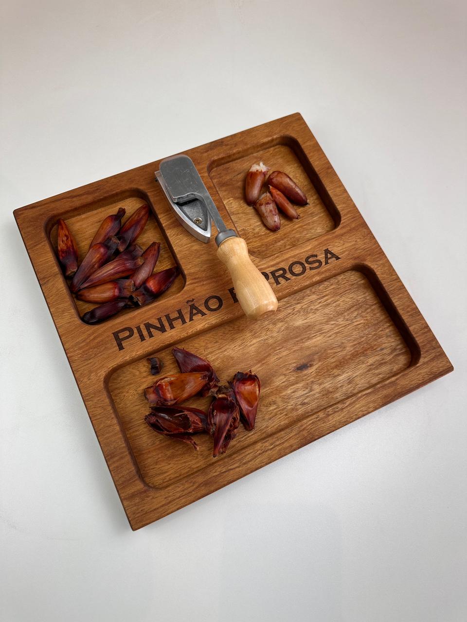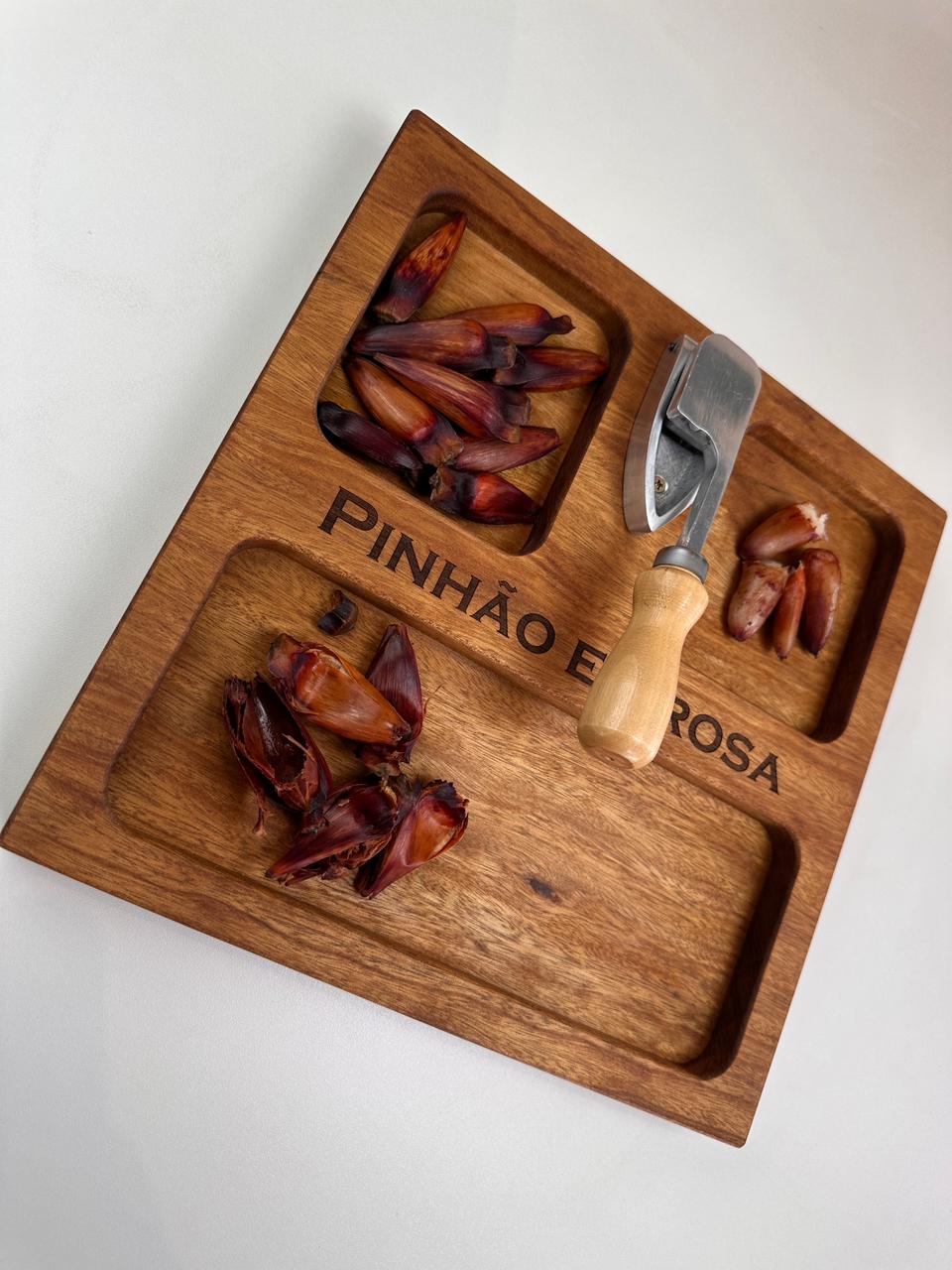 Nossa tábua para pinhão (30x30x3,5 cm) foi desenvolvida para deixar tudo mais prático e especial: com espaços para a casca, o pinhão e o pinhão cozido, ela organiza e valoriza cada detalhe desse ritual.