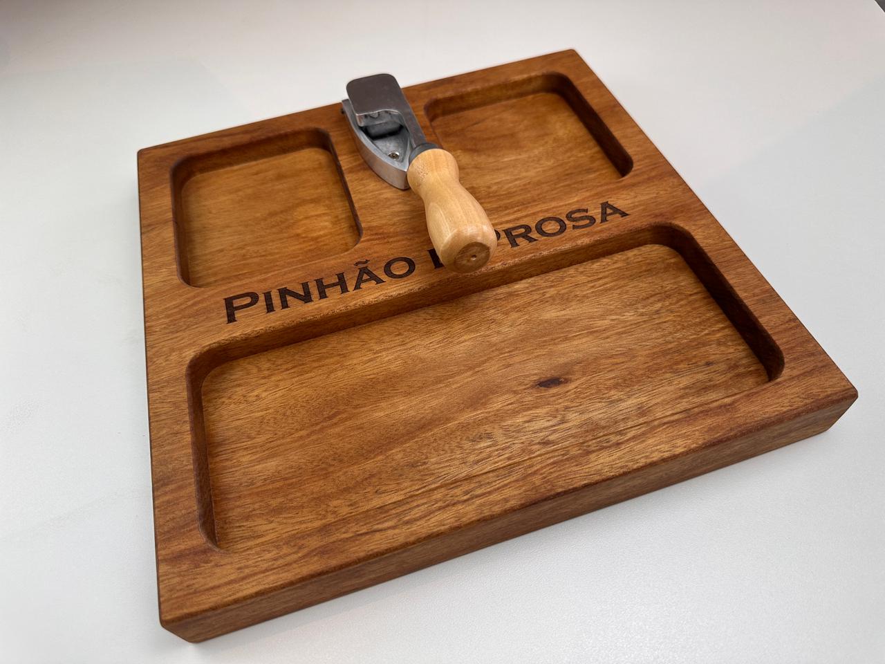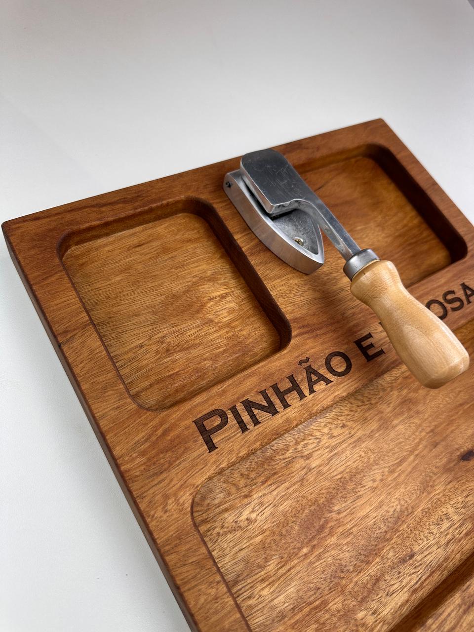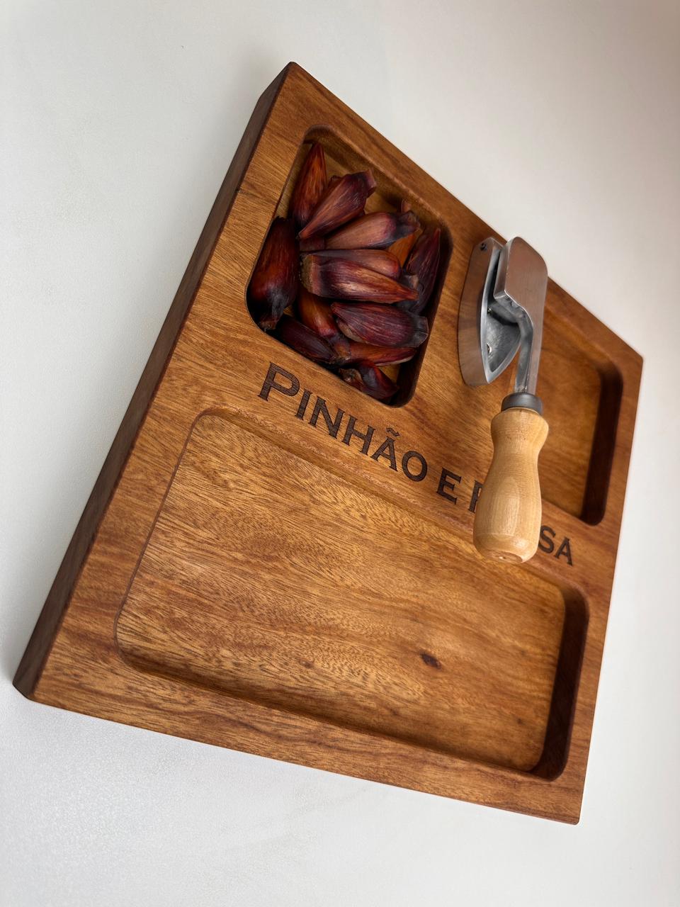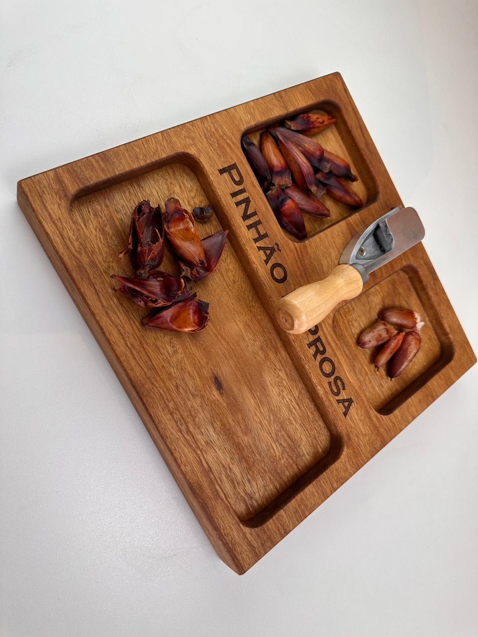 Nossa tábua para pinhão (30x30x3,5 cm) foi desenvolvida para deixar tudo mais prático e especial: com espaços para a casca, o pinhão e o pinhão cozido, ela organiza e valoriza cada detalhe desse ritual.
