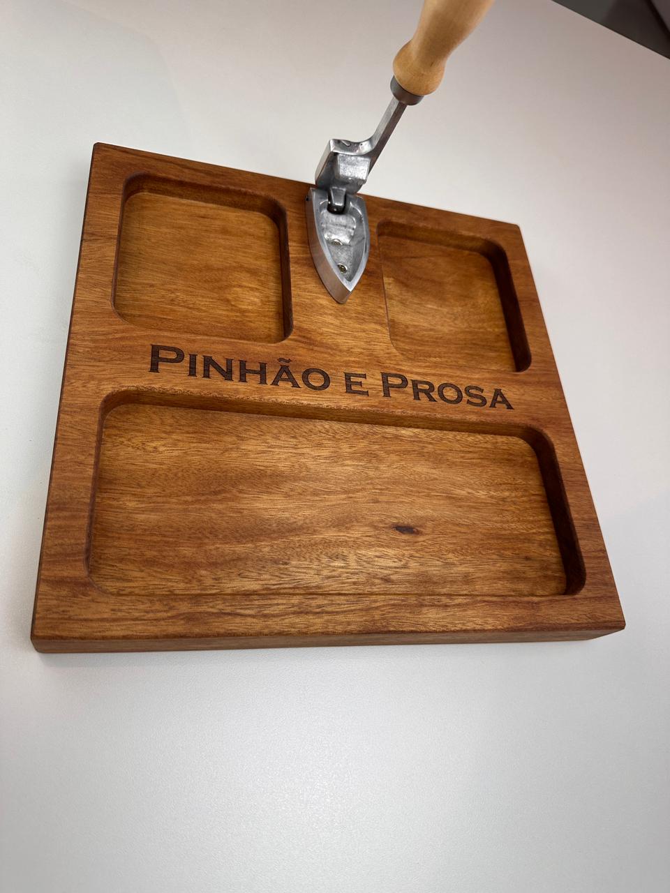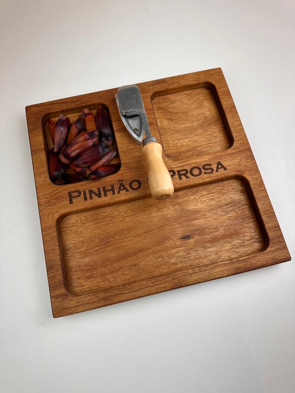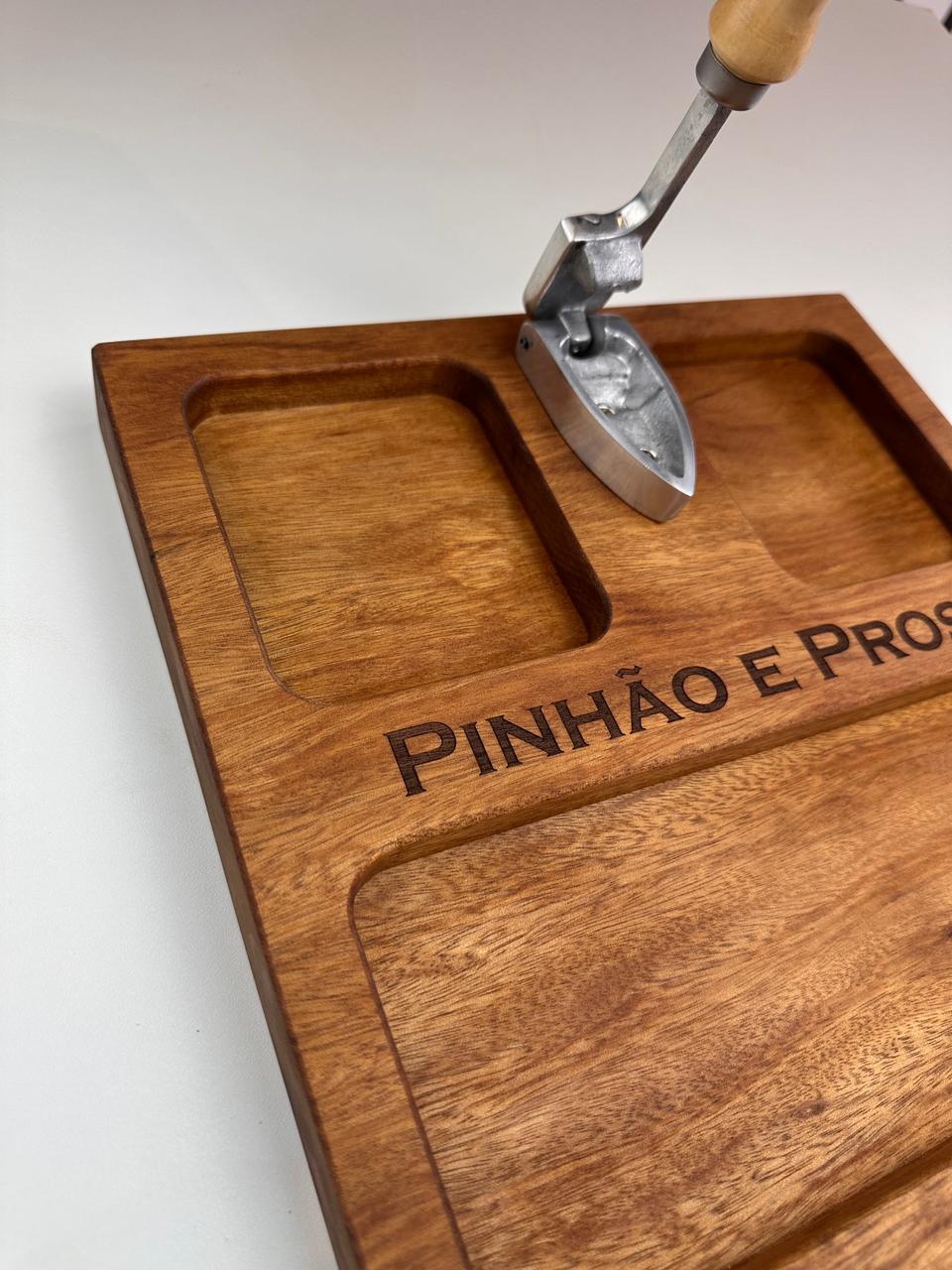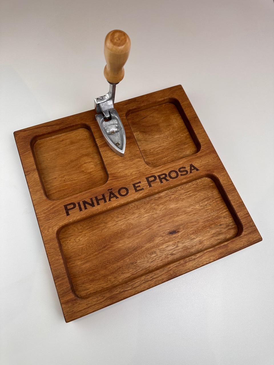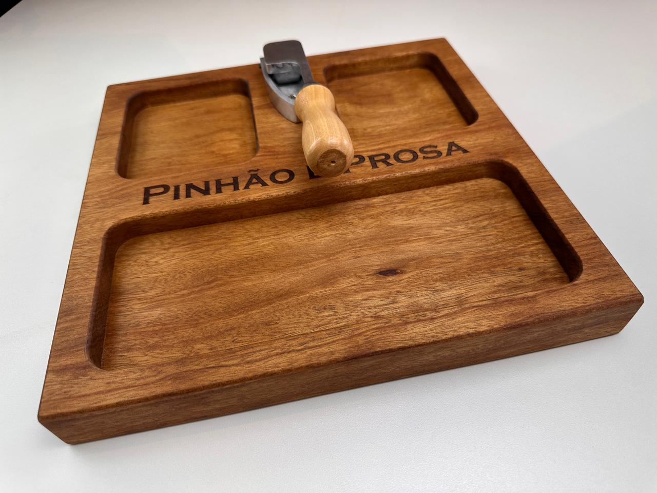 Nossa tábua para pinhão (30x30x3,5 cm) foi desenvolvida para deixar tudo mais prático e especial: com espaços para a casca, o pinhão e o pinhão cozido, ela organiza e valoriza cada detalhe desse ritual.